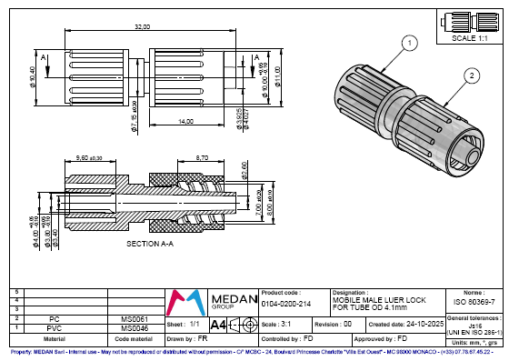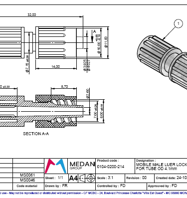 Mobile male Luer Lock for tube O.D. 4.1 mm